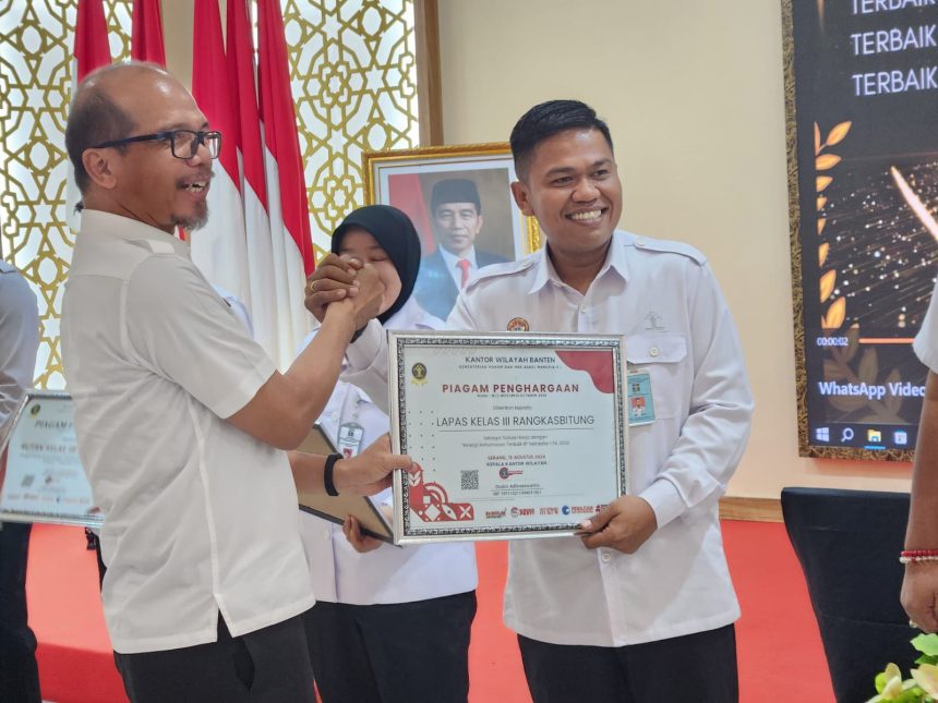 Lebak,bantenpedia.id – Lapas Rangkasbitung Kanwil Kemenkumham Banten mendapatkan juara III Kategori Kinerja Kehumasan pada satuan kerja di Lingkungan Kanwil Kemenkumham Banten tahun 2024 yang bertempat di Kanwil Kemenkumham Banten, Rabu (21/08).
