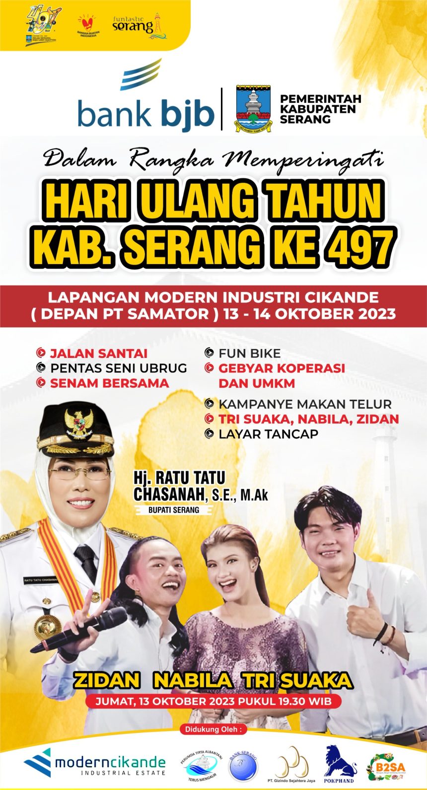 Kab. SerangAyo ikuti jalan sehat dalam rangka HUT Kabupaten Serang ke 497 di Lapangan Modern Industri Cikande 13-14 Oktober 2013 Redaksi Bantenpedia.id 10 Oktober 2023 Share SHARE - Advertisement - Pemkab Serang Yakini Peserta Latsitardanus XLV/2025 Bawa Dampak yang Positif Diusung 6 Parpol, Andika-Nanang Daftar ke KPU Kabupaten Serang Jasa Raharja Wilayah Banten Bersama Bapenda dan Polres Kabupaten Serang Gelar Razia, Ingatkan Bayar Pajak Kendaraan Deklarasikan Andika-Nanang, PKB Akan Kerahkan 29 PAC se-Kabupaten Serang Danrem 064/MY Tinjau Rehab Panti Asuhan di Serang, Kehadiran TNI AD Terasa di Tengah Masyarakat Share berita ini Facebook Whatsapp Whatsapp Telegram Copy Link Share Previous Article Forum Komunikasi Lalu Lintas Tangerang Kampanyekan Keselamatan Berlalu Lintas di Universitas Multimedia Nusantara Next Article Kepala PT Jasa Raharja Perwakilan Tangerang Berpartisipasi dalam Rapat Forum Keselamatan Lalu Lintas - Advertisement -Berita Terbaru JMI menggelar konferensi pers, Dorong Penanganan Dugaan Pelanggaran di BGN Diproses Transparan Jakarta 17 April 2026 Hadirkan Kepastian Jaminan Lebih Dekat, Jasa Raharja Banten Optimalkan Operasional Lokasi Baru Gerai Samsat Bojonegara Kab. Serang 17 April 2026 2.000 Pesilat Siap Ramaikan Open Tournament Pencak Silat Nasional Bumi Sukowati Championship II di Kota Tangerang Kota Tangerang 17 April 2026 Dilaunching, Bupati Serang Pastikan Layanan Serba Digi Aman Adanya Tim Tanggap Insiden Siber Kab. Serang 17 April 2026