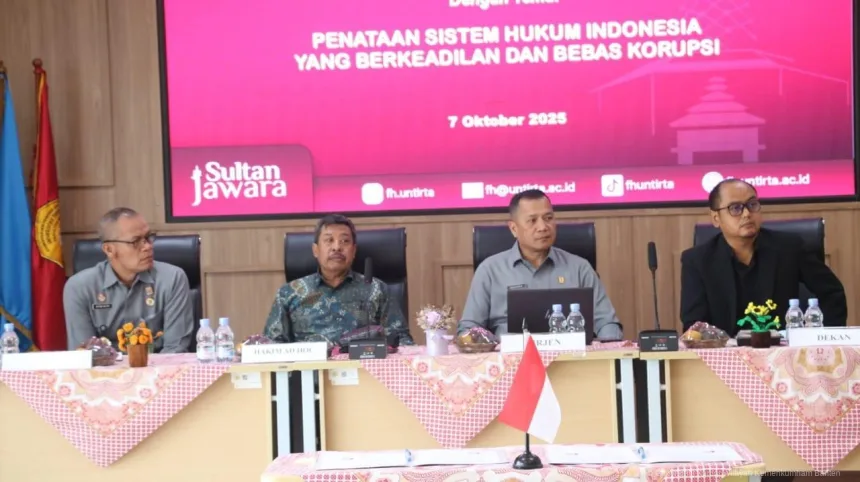 SERANG, Bantenpedia.id – Fakultas Hukum Universitas Sultan Ageng Tirtayasa (FH Untirta) menggelar kuliah umum bertema “Penataan Sistem Hukum Indonesia yang Berkeadilan dan Bebas Korupsi”, Selasa (07/10/2025), sebagai bagian dari rangkaian Dies Natalis ke-44 Fakultas Hukum Untirta.