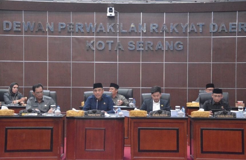 KOTA SERANG – Wakil ketua I DPRD Kota Serang Roni Alfanto pimpinan rapat paripurna tentang tanggapan dan/jawaban Fraksi-fraksi DPRD Kota Serang atas pendapat Wali Kota Serang terhadap Raperda Usul DPRD Kota Serang, dan dilanjutkan Pembentukan Panitia Khusus bertempat di ruang rapat paripurna gedung DPRD Kota Serang, Selasa (18/2/2025).