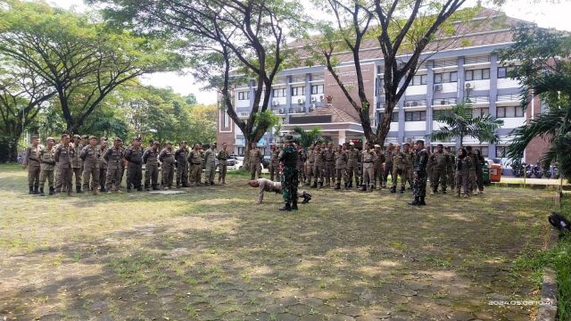 Pengenalan Baris Berbaris (PBB), ini merupakan bagian dari pengulangan untuk seluruh anggota satpol PP yang hadir dalam kegiatan ini.