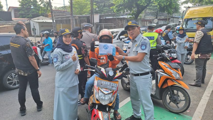 Kota Tangerang, bantenpedia.id – PT Jasa Raharja Perwakilan Tangerang Cabang Banten bersama Polres Metro Tangerang dan Tim Pembina Samsat Cikokol mengkampanyekan Keselamatan Berlalu Lintas dengan melaksanakan kegiatan Aksi Simpatik bagi pengguna sepeda motor. Kegiatan ini dilaksanakan pada hari Kamis tanggal 16 Mei 2024 pukul 08.00 WIB di Jl. Raya Daan Mogot, tepatnya di dekat Satpas SIM Polres Metro Tangerang Kota, Kelurahan Sukarasa, Kecamatan Tangerang, Kota Tangerang.