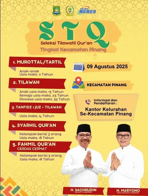Kota Tangerang, bantenpedia.id – Setelah suksesnya berbagai kegiatan keagamaan, kini giliran Kecamatan Pinang bersiap menggelar Seleksi Tilawatil Qur’an (STQ) Tingkat Kecamatan tahun 2025. Acara kompetisi keagamaan yang dinanti-nantikan ini dijadwalkan akan berlangsung pada 9 Agustus 2025, bertempat di wilayah Kecamatan Pinang.