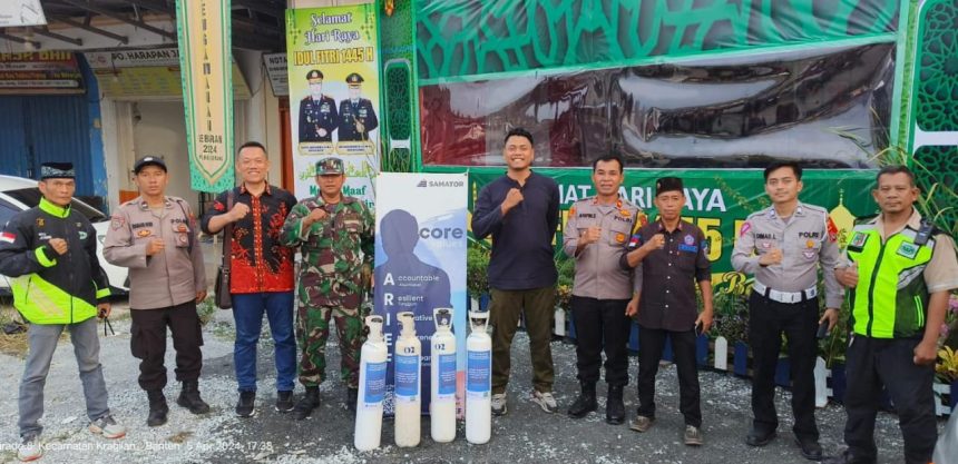 SERANG, Bantenpedia.id – Koramil 0602-19/Cikande Kodim 0602/Serang dan Dinas Kesehatan Provinsi Banten/Dinas Kesehatan Kabupaten Serang, menggandeng Samator Group Area Banten memberikan bantuan Enam Tabung Gas Oksigen di Pos Pelayanan Kesehatan Mudik Lebaran 1445 H Tahun 2024, karena diperkirakan arus pemudik melintas jalur Serang menuju Jakarta sangat tinggi dibanding tahun sebelumnya, Sabtu (06/04/2024).
