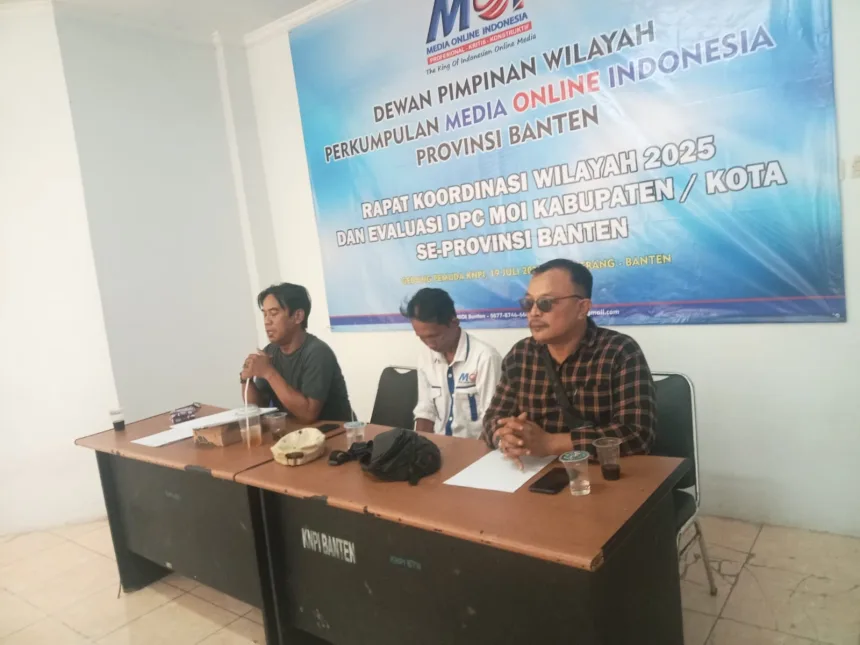 Serang – Media Online Indonesia (MOI) Provinsi Banten mengadakan Rapat Koordinasi Wilayah sekaligus evaluasi kinerja Dewan Pimpinan Cabang (DPC) dari seluruh kabupaten dan kota se-Provinsi Banten. Kegiatan berlangsung di Aula KNPI, Kawasan Pusat Pemerintahan Provinsi Banten (KP3B), pada Sabtu (19/7/2025).