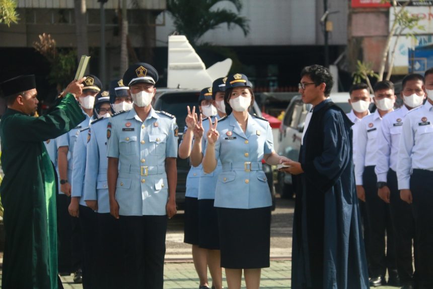 SERANG, (Bantenpedia.id) – Kepala Kantor Wilayah Kementerian Hukum dan HAM Banten, Tejo Harwanto melantik dan mengambil sumpah sebanyak 90 (sembilan puluh) Calon Pegawai Negeri Sipil (CPNS) di lingkungan Kementerian Hukum dan HAM untuk selanjutnya diangkat sebagai Pegawai Negeri Sipil (PNS), Senin (06/03).