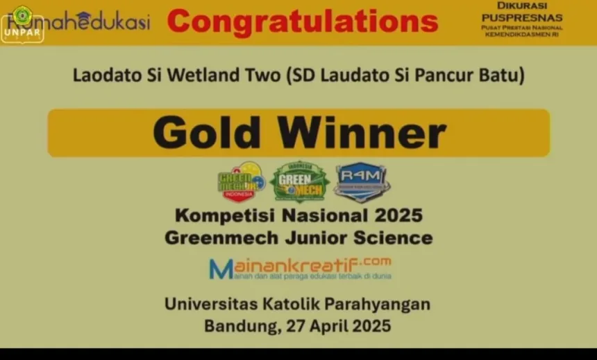 Medan, Bantenpedia.id Prestasi membanggakan kembali diperoleh oleh Tim Robotik SD Laudato Si Pancur Batu dalam ajang Kejuaraan Robotik GreenMech Nasional 2025 yang diselenggarakan oleh Rumah Edukasi dan Universitas Katolik Parahayangan (UNPAR) Bandung Pada ( 27/04/2025 ) dalam kompetisi yang diikuti oleh lebih dari 180 tim dari seluruh Indonesia ini, Tim SD Laudato Si Pancur Batu berhasil meraih medali emas di kategori “GreenMech Junior Science.” Tim SD Laudato Si Pancur Batu juga berhasil meraih Honorable Mention (Juara Harapan) di kategori “R4M Basic”